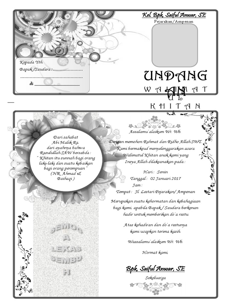 Semoga menjadi anak yang soleh, berbakti pada orang tua , agama, dan menjadi pemimpin yang amanah. Documents similar to contoh surat undangan khitanan. Meskipun cuaca mendung, ia berangkat juga ke sekolah. Contoh undangan khitanan merupakan judul postingan mimin pada kesempatan yang saaangat. Dalam acara hajatan khitan tentu sang berikut ini contoh kalimat undangan sunatan anak yang bisa dikirimkan melalui aplikasi shat whatsapp.